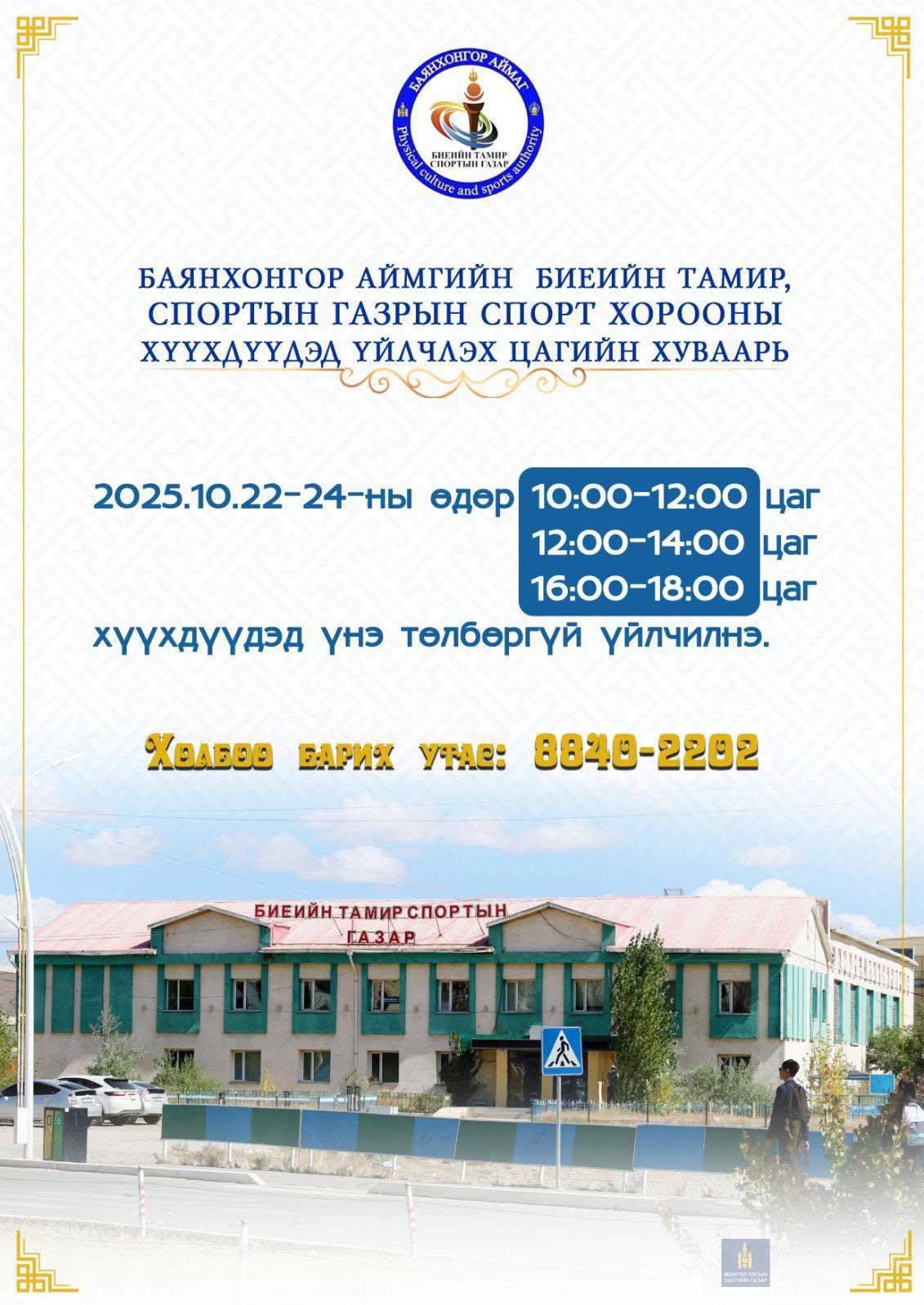Сурагчдын бие даалтын 7 хоногтой холбогдуулан Баянхонгор аймагт спорт заал, соёлын үзвэр үйлчилгээг хүүхэд багачуудад үнэ төлбөргүй хүргэх зохицуулалтыг аймаг орон нутгаас хийсний дагуу Биеийн тамир спортын газрын спорт хорооны заал дараах хуваарийн дагуу үйлчлэнэ.