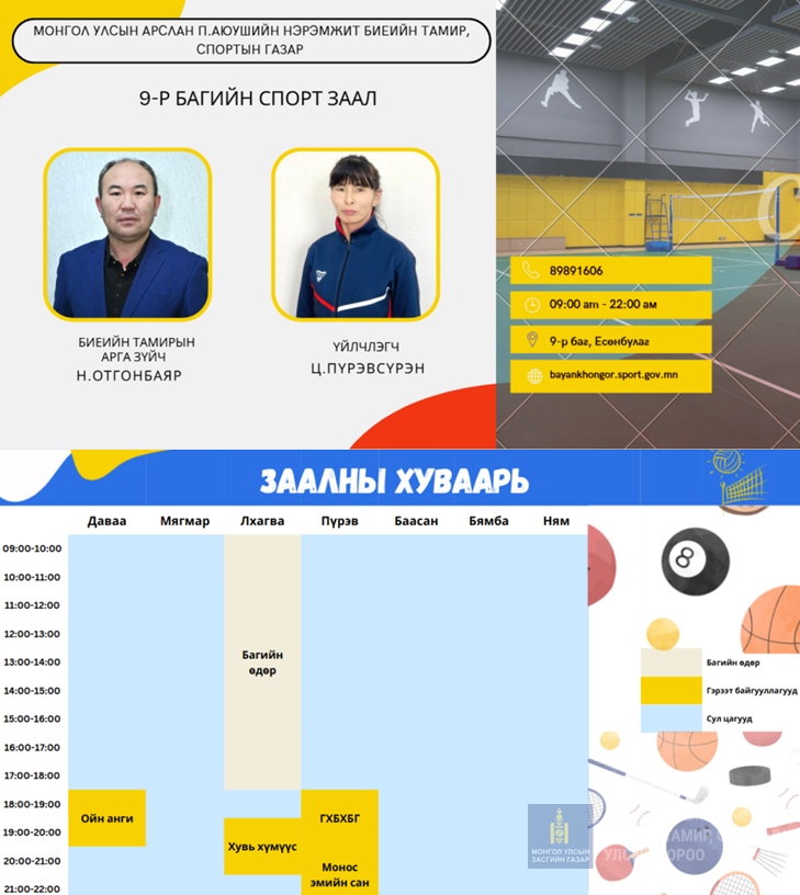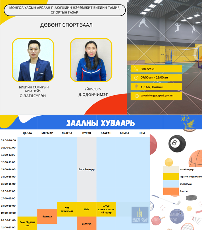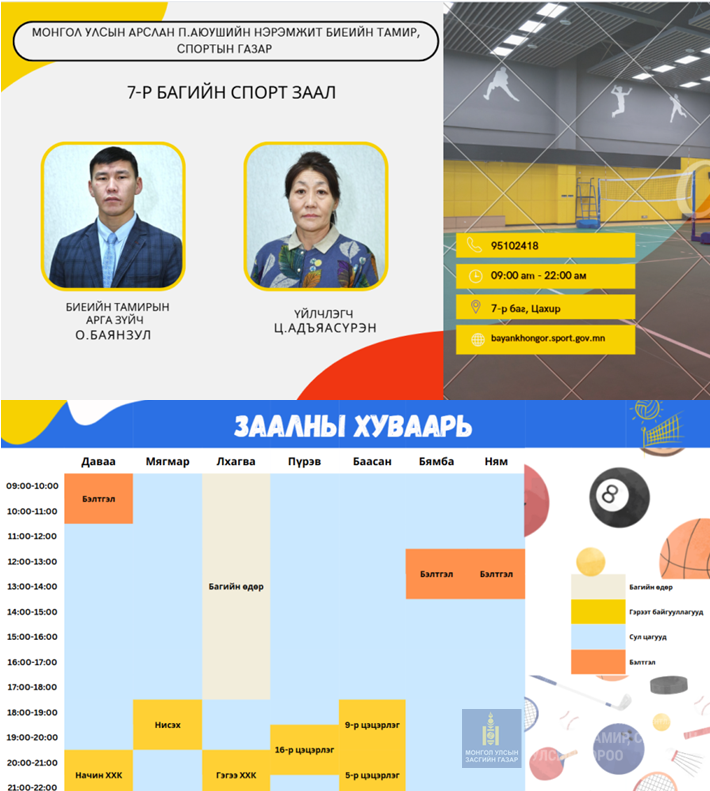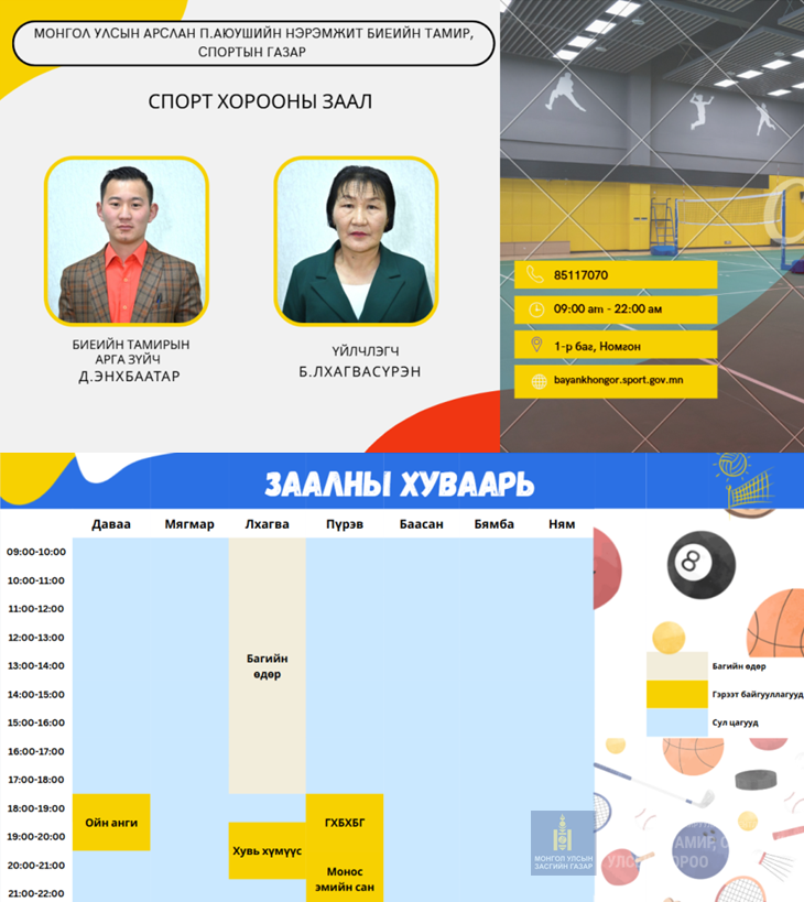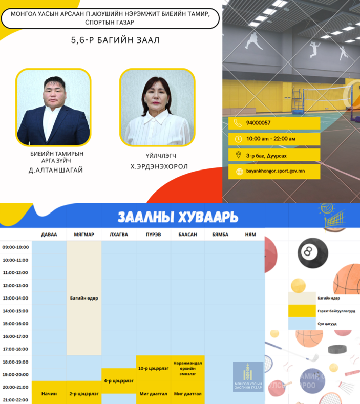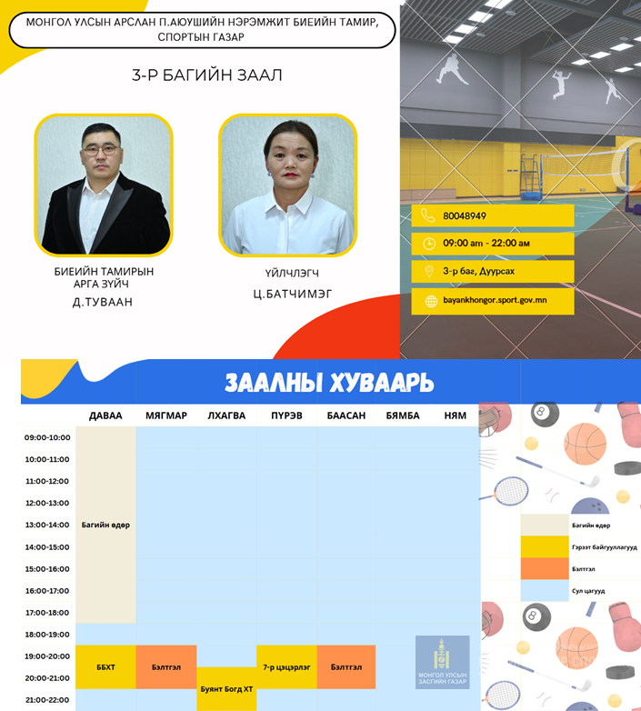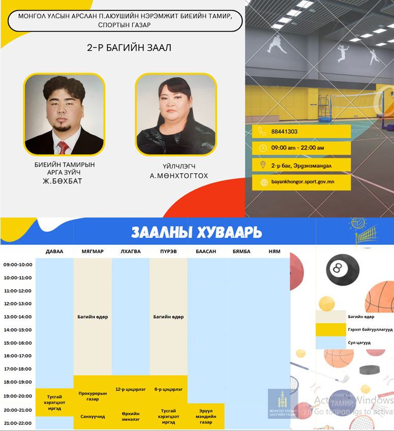 БИЕИЙН ТАМИР, СПОРТЫН ГАЗРЫН ДЭРГЭДЭХ СПОРТЫН ЗААЛНУУДЫН МЭДЭЭЛЭЛ, ХУВААРЬ
